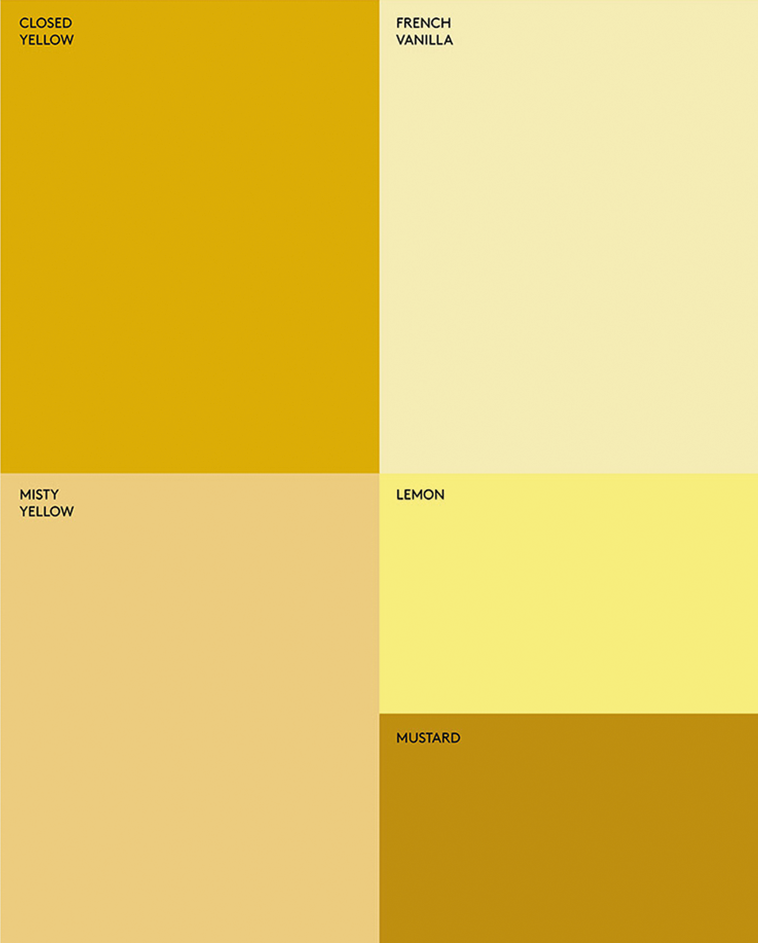 The color palette is rooted in a refined spectrum of yellow tones, creating a distinct yet understated visual language. Ranging from soft, muted hues to more saturated shades, the palette brings warmth, depth, and a sense of playfulness while maintaining a cohesive and contemporary expression.